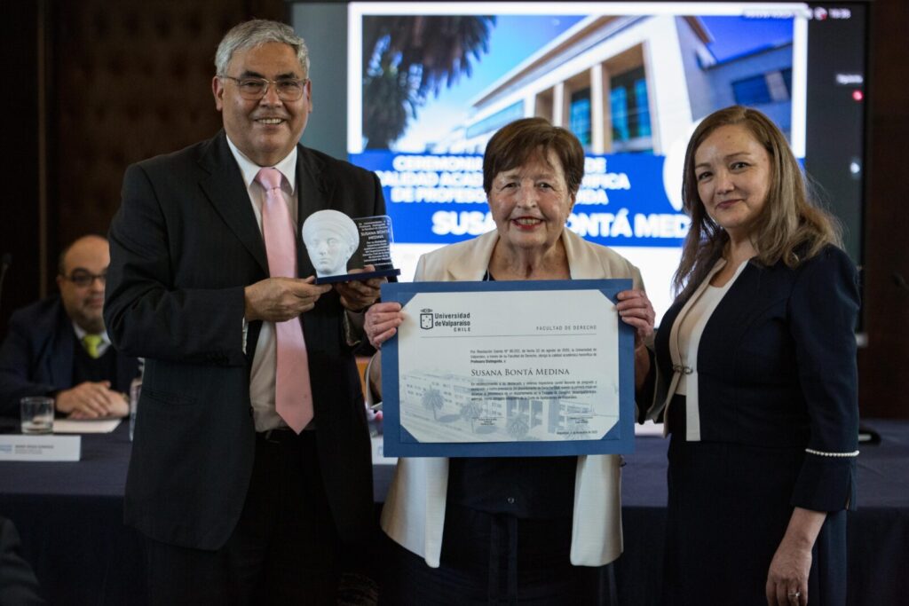 “Más en lo que nos toca más de cerca, doña Susana fue durante décadas profesora de Derecho Civil y presidenta del departamento de Derecho Civil, esta última rama ha sido aquella en donde ha desplegado su labor docente y donde han bebido generaciones de alumnos que hoy le rinden justo homenaje, por lo mismo es que en este acto se le entregará la calidad honorífica de Profesora Distinguida de la Facultad de Derecho de la Universidad de Valparaíso. Junto con esta importante distinción hemos querido también como comunidad universitaria reservar un espacio significativo en nuestro edificio para recordar permanentemente la relevante contribución de la profesora Bontá, que ha volcado en la formación de numerosas cortes de profesionales jurídicos de esta Escuela. Por esa razón, el Consejo de la Facultad también ha decidido que a partir de hoy la Sala de Litigación de la Escuela de Derecho lleve el nombre de Susana Bontá Medina. Lo anterior nos permitirá narrar a las futuras generaciones que en mucho sentido la profesora fue una adelantada a su tiempo, incorporándose a la escuela como la primera mujer profesora de Derecho Civil”, cerró.