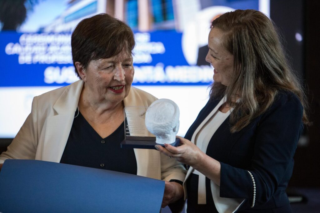 El diploma con el que se concedió la calidad honorífica de Profesora Distinguida a Susana Bontá fue entregado por el decano Ricardo Saavedra y la vicedecana Patricia Reyes, junto con un galvano conmemorativo de la ocasión, correspondiente a una réplica en miniatura de la “Donna”, escultura antigua de gran valor arqueológico que representa la cabeza de una dama romana de la época de los Antoninos, y que fue donada a la UV por la embajada italiana a mediados del siglo pasado.