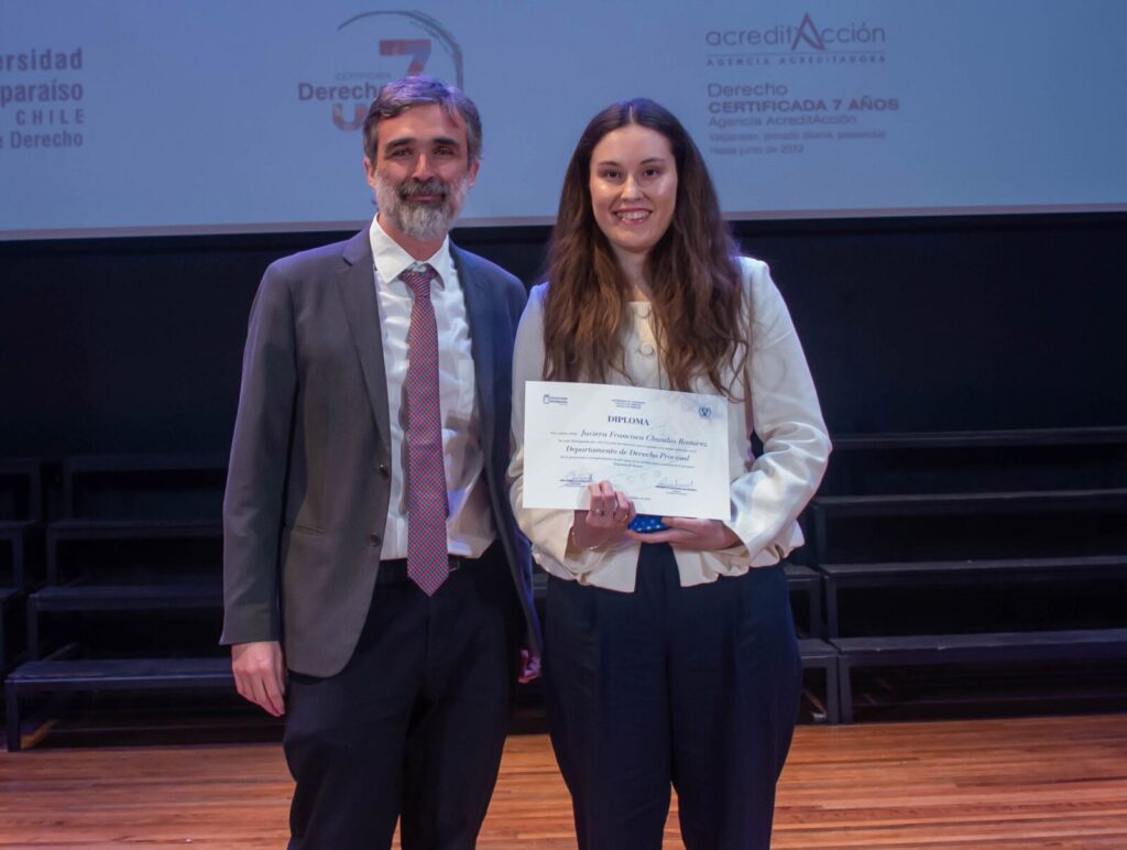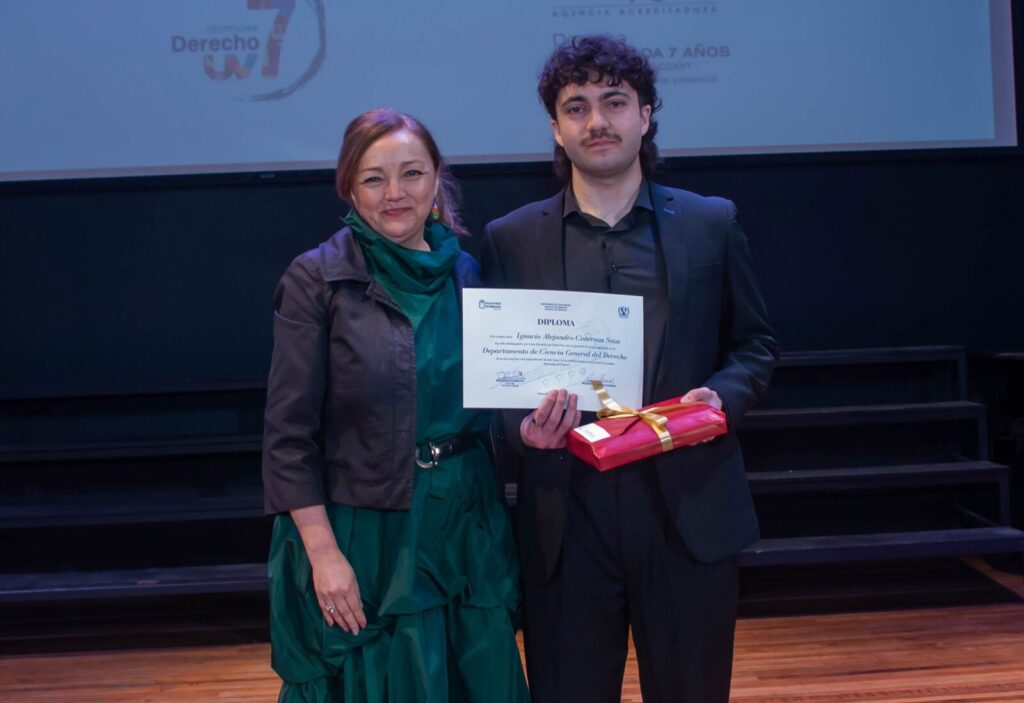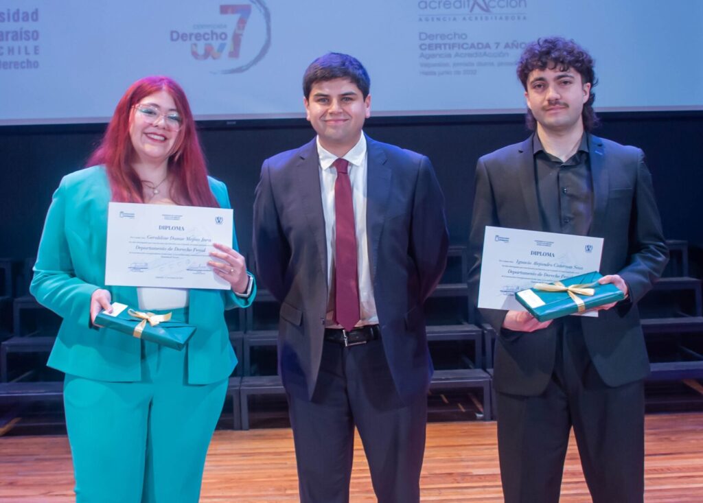 El egresado Ignacio Cisternas recibió el premio del departamento de Ciencia General del Derecho y del departamento de Ciencias Penales, éste último junto a la egresada Geraldine Mejías.