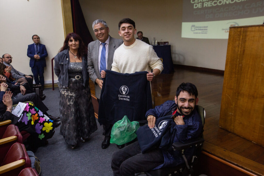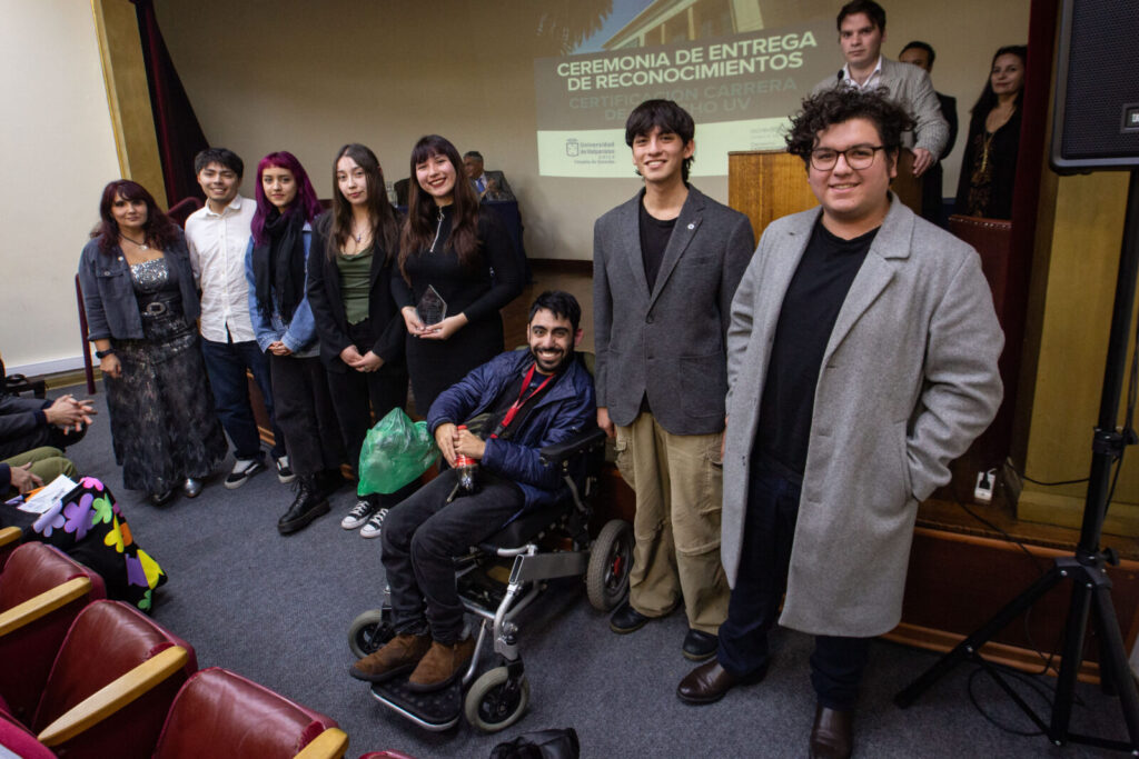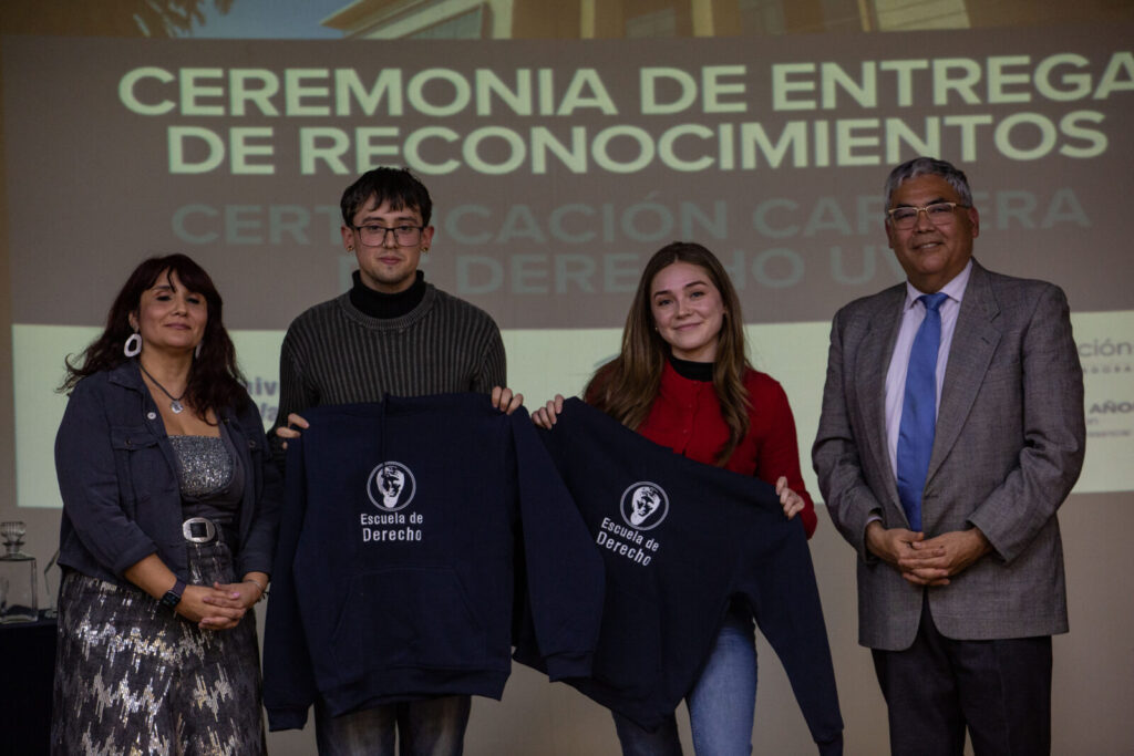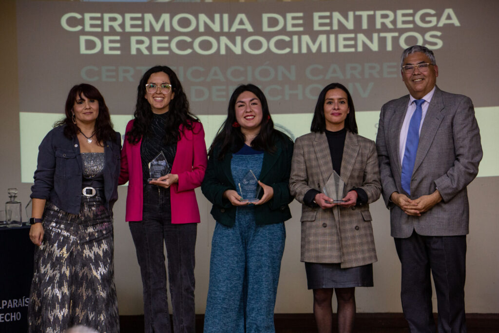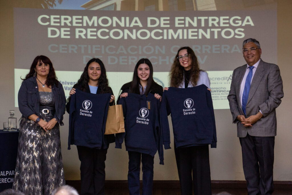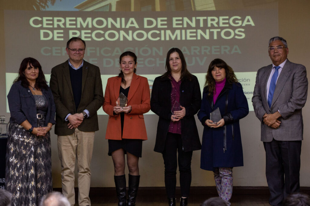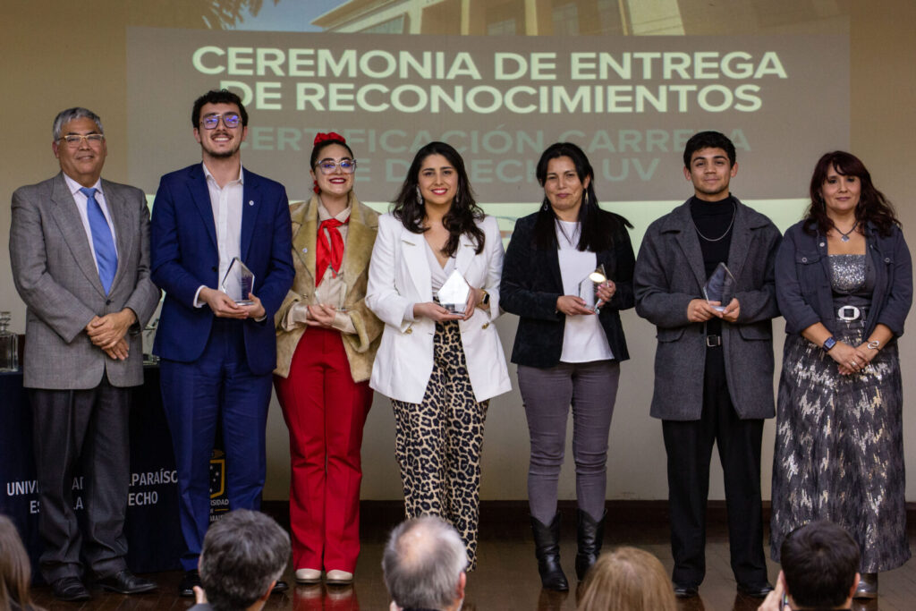 Por otro lado, se hizo entrega de reconocimientos a integrantes de la comunidad de la Escuela de Derecho de la UV que apoyaron directamente las labores del Comité de Autoevaluación, los cuales fueron dirigidos a Nicole Contreras, Ibzán Orellana y Diego Pérez, estudiantes que participaron y colaboraron en las distintas instancias de difusión del proceso de Certificación; Camila Cortez, periodista de la Facultad de Derecho; Paola Salinas, encargada de Biblioteca de la Escuela de Derecho; y el actual Centro de Estudiantes de Derecho -presidido por Tamara Morales-, en representación de los Centros de Estudiantes que se desempeñaron en el periodo 2018-2025.