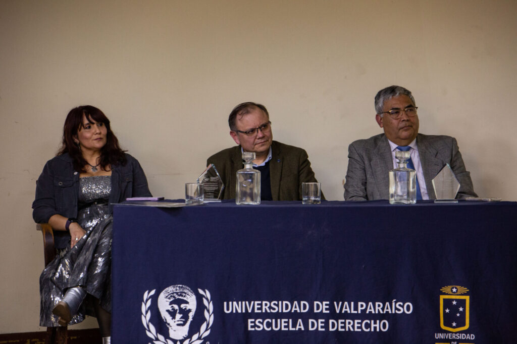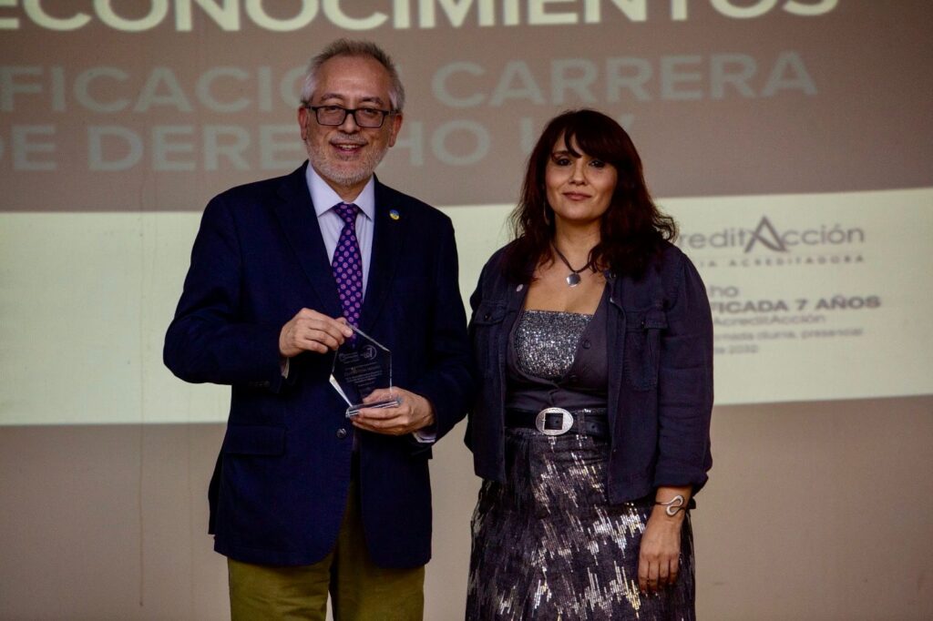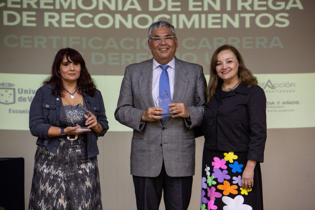 Finalizado su discurso, la académica Patricia Reyes entregó un reconocimiento especial al exdirector de la Escuela de Derecho, Claudio Oliva, y a las actuales autoridades de la Facultad y Escuela de Derecho, Ricardo Saavedra e Inés Robles, respectivamente. El exdecano Alberto Balbontín no pudo participar de la ceremonia, por lo que las autoridades le dedicaron palabras de agradecimiento por su gestión durante 15 años y su aporte a los procesos de certificación que lideró en su mandato.