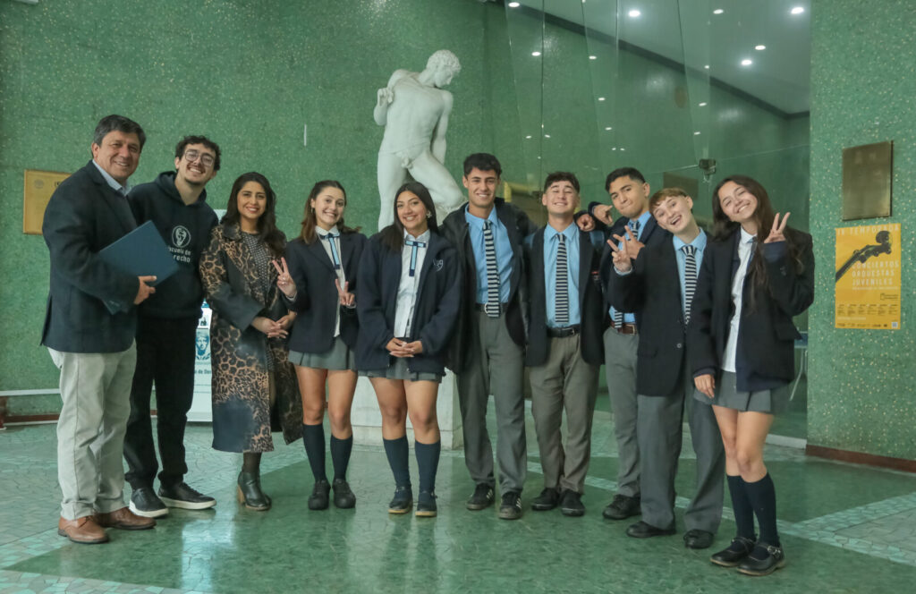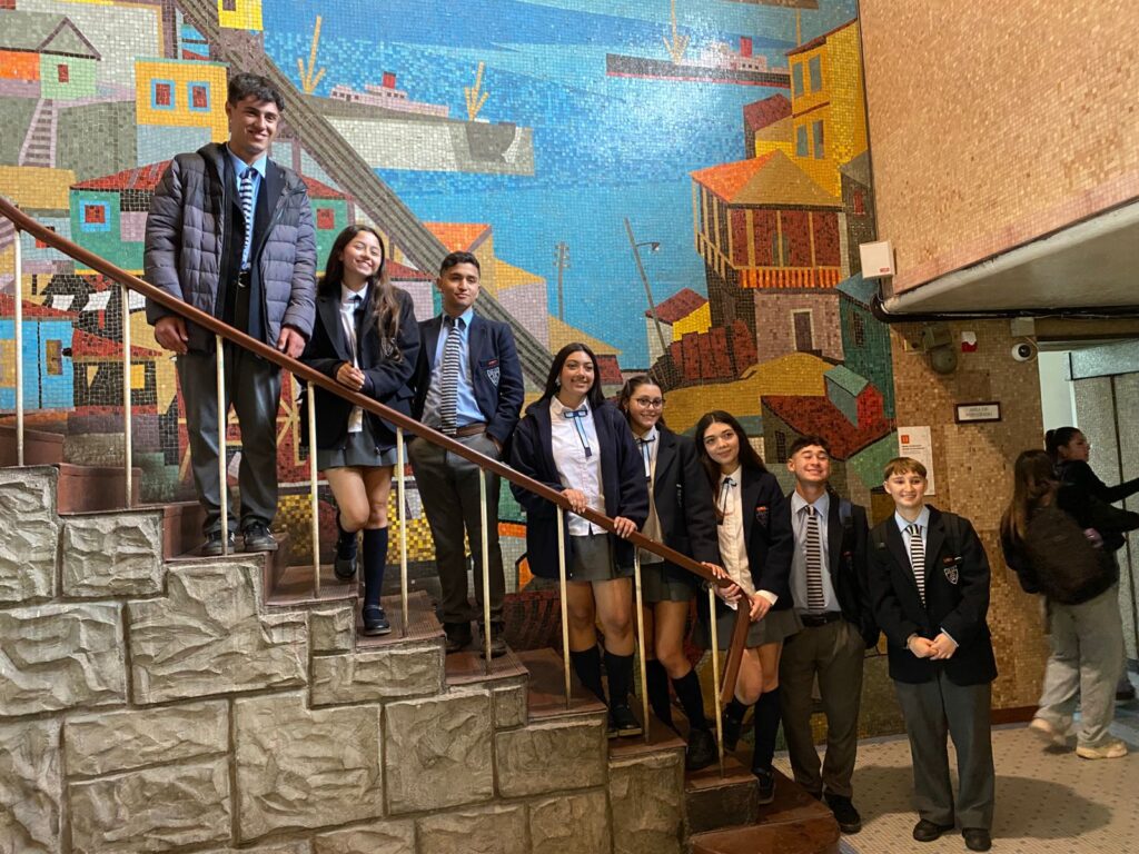 Finalmente, el grupo del Colegio SS.CC. de Viña del Mar fue parte de un recorrido guiado por el edificio de la Escuela de Derecho, donde los estudiantes pudieron conocer los rincones y características del inmueble de alto valor histórico que data de fines de la década de 1950, que alberga mosaicos, pinturas y esculturas de afamados artistas, entre los que se cuentan Vicenzo Gemito y Vicenzo Dante, además del premio Nacional de Arte Camilo Mori, autor del mural “Escena Valparaíso”.