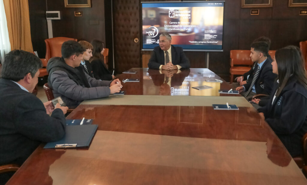 El grupo estuvo encabezado por el profesor del establecimiento, Cristian Ayala, y fue recibido por la periodista de la Facultad de Derecho de la UV, Camila Cortez, y el ayudante de Extensión, Ibzán Orellana.