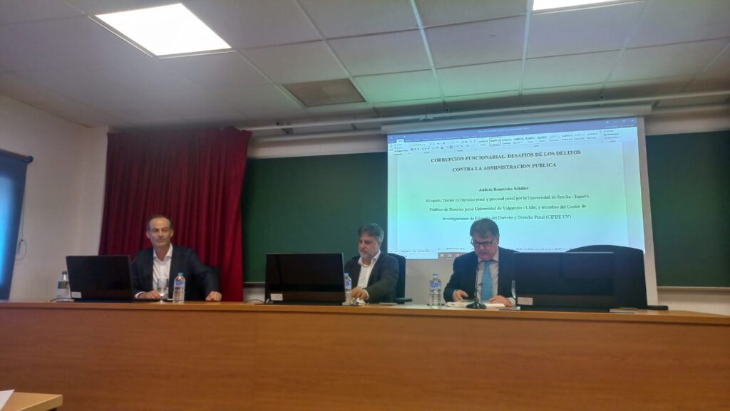 Una vez cumplidos los objetivos centrales de su estadía, el académico realizó clases de pregrado en la Facultad de Derecho de la Universidad CEU Fernando III, en Andalucía, donde presentó la ponencia “El sistema de persecución jurídico-penal en Chile y la reciente modificación legal en España”, instancia en que ofreció un análisis comparado entre ambos ordenamientos, especialmente en lo relativo a los procedimientos, los órganos competentes y las dinámicas propias de la investigación y el enjuiciamiento penal.